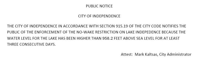 Public Notice: No Wake Restriction on Lake Independence Due to High Water Level 8 May Share this post